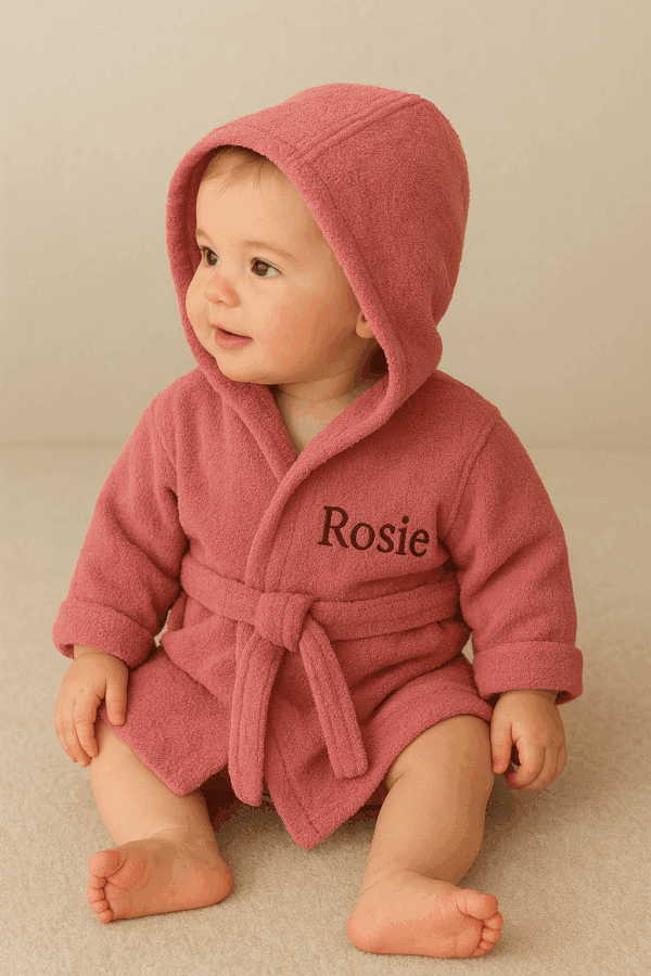 Zachte baby badjas van hoogwaardig badstof met capuchon en persoonlijke naam borduring. Warm, comfortabel en ideaal na het bad of zwembad. Een uniek en persoonlijk cadeau!