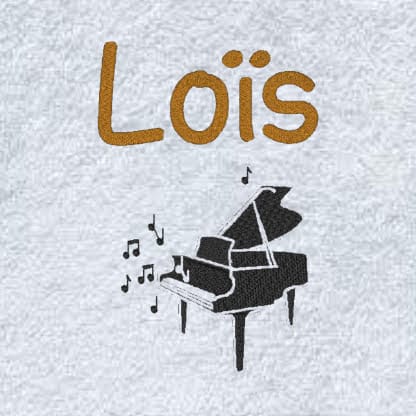 Handdoek piano en naam, geborduurd op een zachte badhanddoek van 50 x 100 cm. Hoogwaardige kwaliteit met uitstekende droog eigenschappen en een decoratief diagonaal eindmotief.