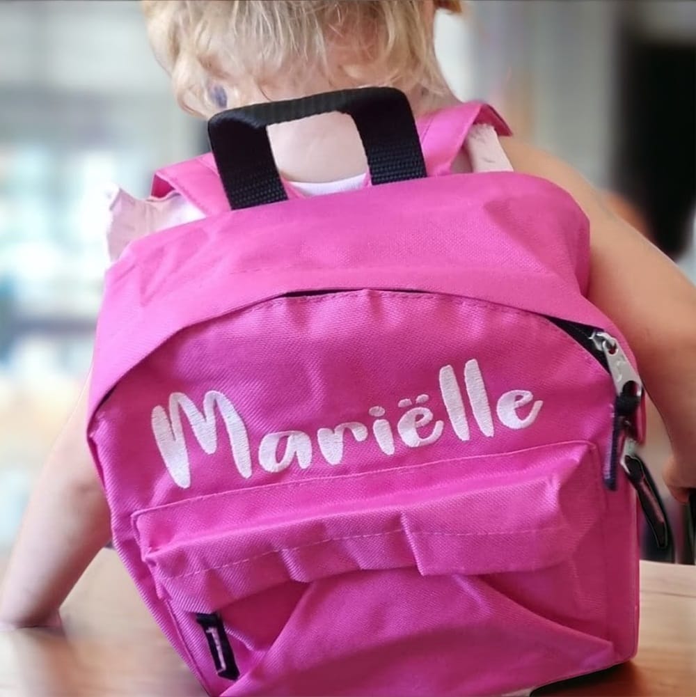 Kinder rugtas met naam, verkrijgbaar in 7 kleuren. Praktisch, gepersonaliseerd en geschikt voor school, sport en uitstapjes.